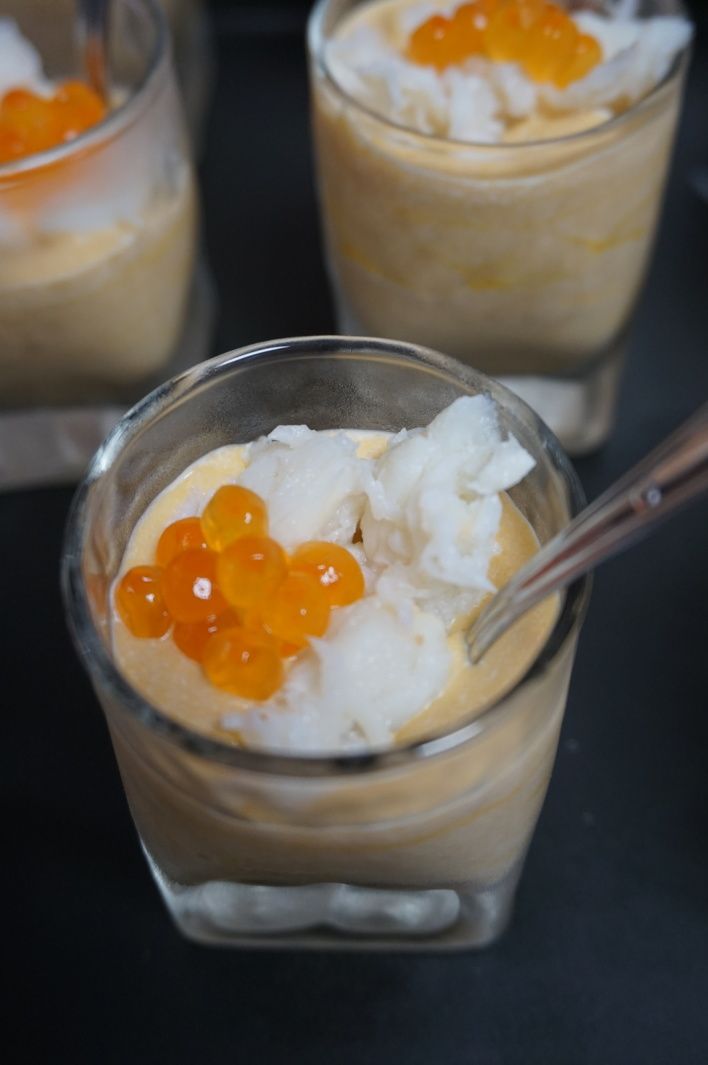 Déposer sur le dessus des miettes de crabe et des oeufs de saumon.